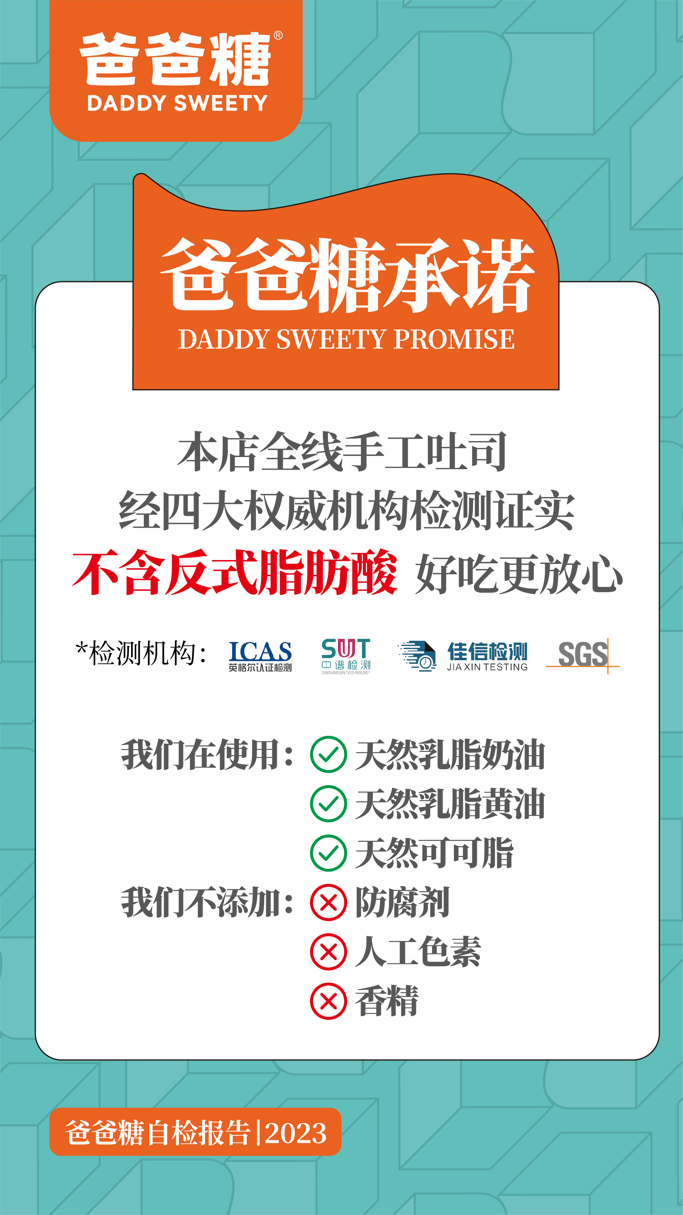 最后,爸爸糖承諾:本店全線手工吐司,經(jīng)四大權(quán)威機(jī)構(gòu)檢測(cè)證實(shí),不含反式脂肪酸,好吃更放心!